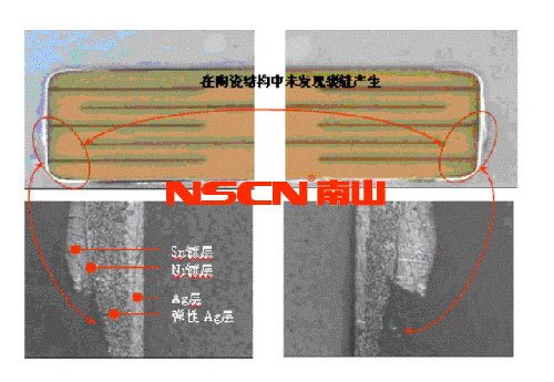 在破壞性的抗折板測試中,PCB板將持續彎曲直到貼片電容產生破壞為止,在這種模擬比較實驗中,可以發現具有柔性端頭設計的產品中,沒有在陶瓷結構中產生裂縫,而是從彈興銀層產生撕裂現象。