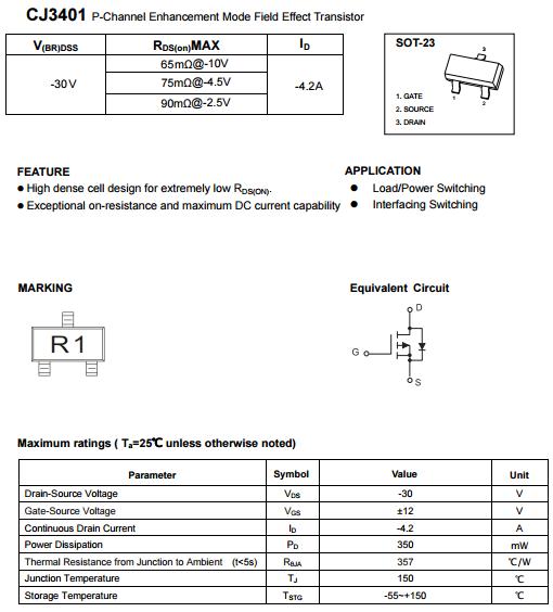 2.其次CJ3401是可以取代AO3401的,CJ3401是P溝道MOS晶體管,是貼度片SOT-23 封裝版,絲印代碼是R1, 主要參數是 4.2A/30V。而市面上熱門的AO3401絲印代碼是 A19T,也是貼片SOT23封裝,兩者的參數是一樣的。