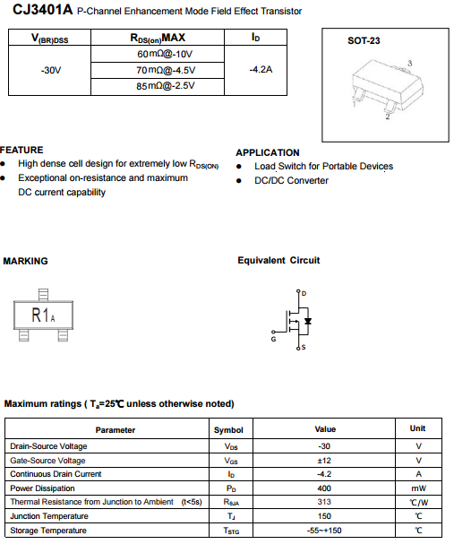 然后就是CJ3401CJ3401A的區別,CJ3401A的絲印是R1A 具體參數的區別我們可以對照兩者的規格書