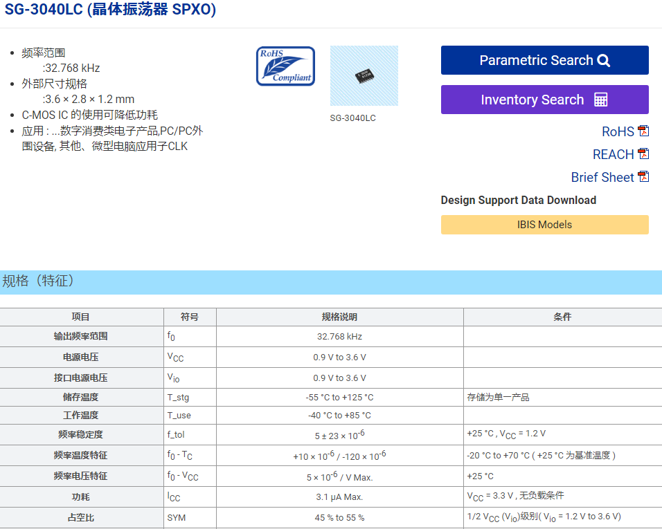 下面來介紹下SG-3040LC,頻率為32.768kHz的SG-3040LC晶體振蕩器(SPXO),該晶體振蕩器可應用于數字消費類電子產品,PC/PC外圍設備,微型電腦應用子CLK等。SG-3040LC輸出頻率范圍32.768 kHz,電源電壓0.9V~3.6V,工作溫度-40 °C to +85 °C,SG-3040LC大致的參數和SG-3040JC差不多,但是兩者*大不同就是SG-3040LC外部尺寸規格:3.6 × 2.8 × 1.2 mm,比SG-3040JC要小很多,下面來給大家分享下SG-3040LC規格書,以供大家選型參考: